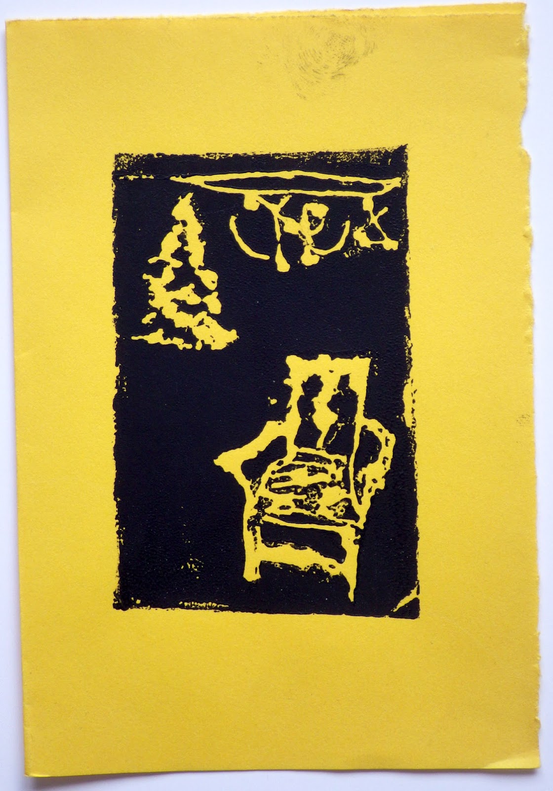 As this was only a test piece I didn't bother with registration, but normally when making a print I have two sets of registration marks: interior marks to place the plate on and exterior marks so that I lay down the paper leaving equal margins. The back of the paper on the lino block is rubbed firmly with a wooden spoon while making sure that the paper does not move.