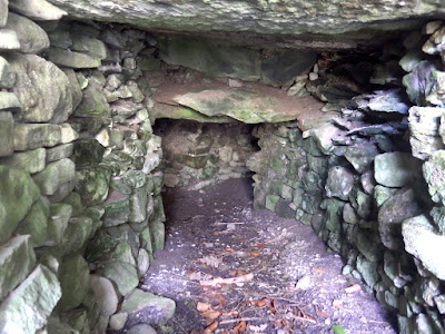 A souterrain at Knowth precludes development of the passage grave for visitors, but the souterrain at Dowth is in a different spot from its entrance. It is barred however (presumably for public safety as Dowth is an open site) but one can peek through the bars at the structure of the passage grave. Having been inside Newgrange, it is easy enough to imagine the end chambers to which this would lead.