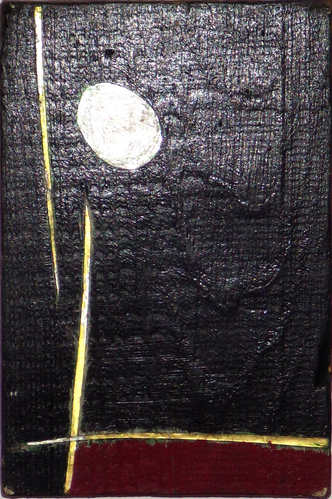 Continuing the theme from the xmas cards, I created small works in the following year on wood blocks that I had readily available (off cuts from various projects). As I gave a number of them away as gifts a few small pieces survive, along with this piece that I kept for myself. I did a couple of larger paintings on sheets of plywood while at university, but these are no longer in existence.