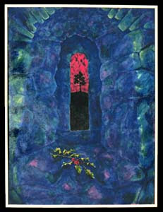 At the time, although I was back in Canada, I started work on a series of paintings based on windows from ruins which were part of my life in Ireland. I exhibited a number of these paintings in a group show at Cedar Ridge Creative Centre in Scarborough in 1992. I brought the series with me to Ireland when I returned in 1993, completed more in the series and started a tour of the large group under the exhibition title "My Tower of Strength". The exhibition opened at Siamsa Tire arts centre in Tralee, Co. Kerry and its last stop was The Courthouse Arts Centre in Tinahely, Co. Wicklow in 1998 taking in a number of galleries in between. This painting, "The Holly & the Oak", is acrylic on canvas, 122 cm x 91.5 cm (4' x 3'), 1992 is in the collection of the Office of Public Works, Ireland. The window is structurally based on Raheenacluig - the church of the little bell - a ruin on the side of Bray Head, in the town where I live.