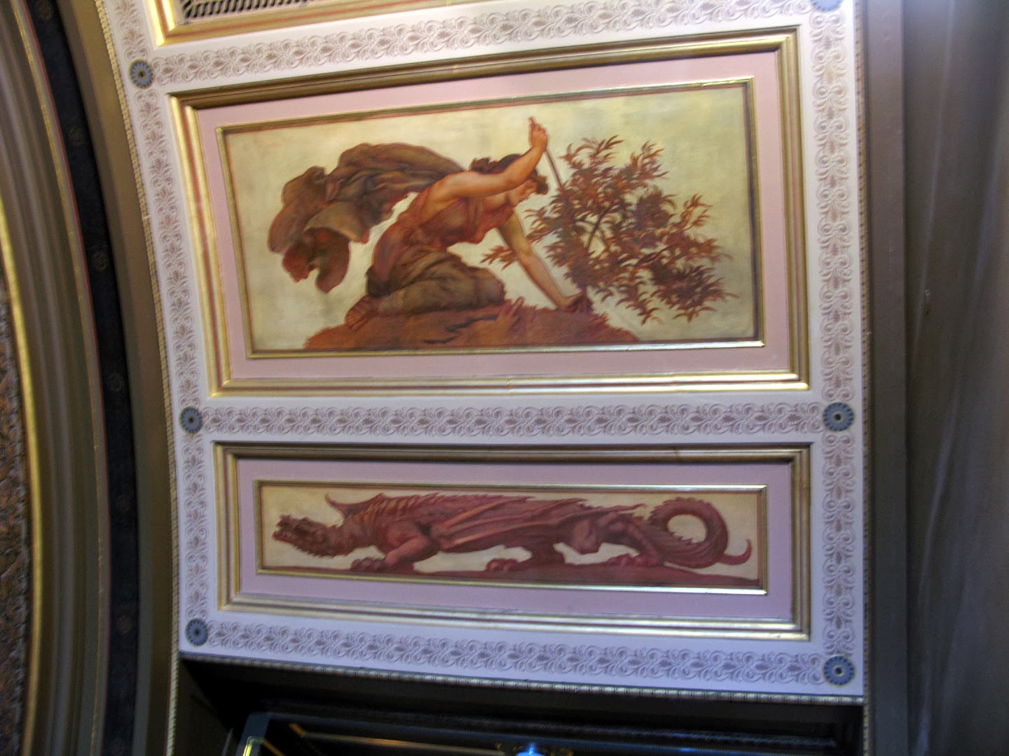 This is "The Industrial Arts as Applied to Peace" -- difficult to photograph because of lighting and size. For a sense of scale, please note that the figures are life size! The arched room is panelled with more Leighton works.